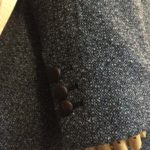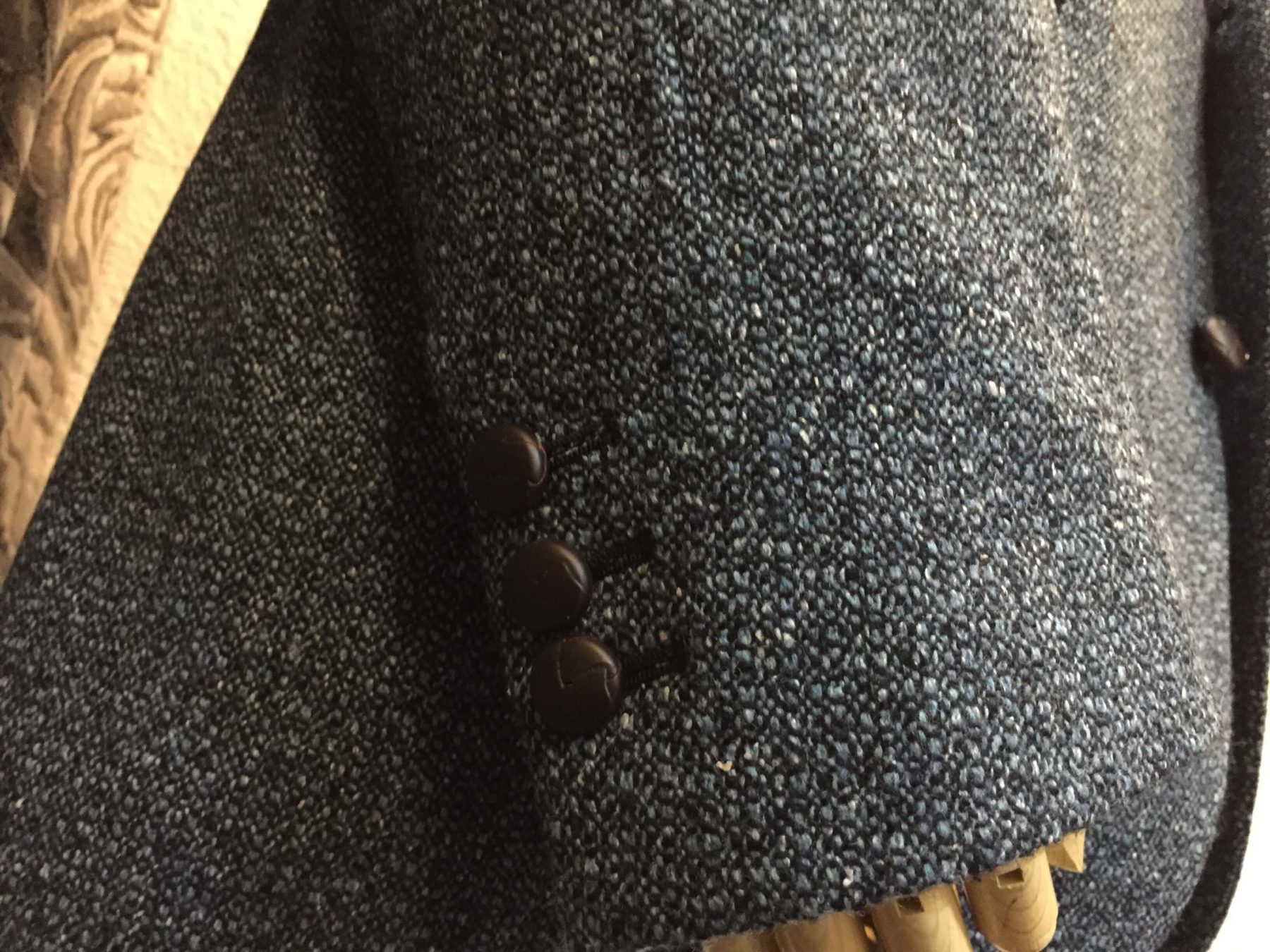 ツイードジャケットに使われることが多い、レザーの編み込みボタンでカジュアル感を取り入れてみました。
