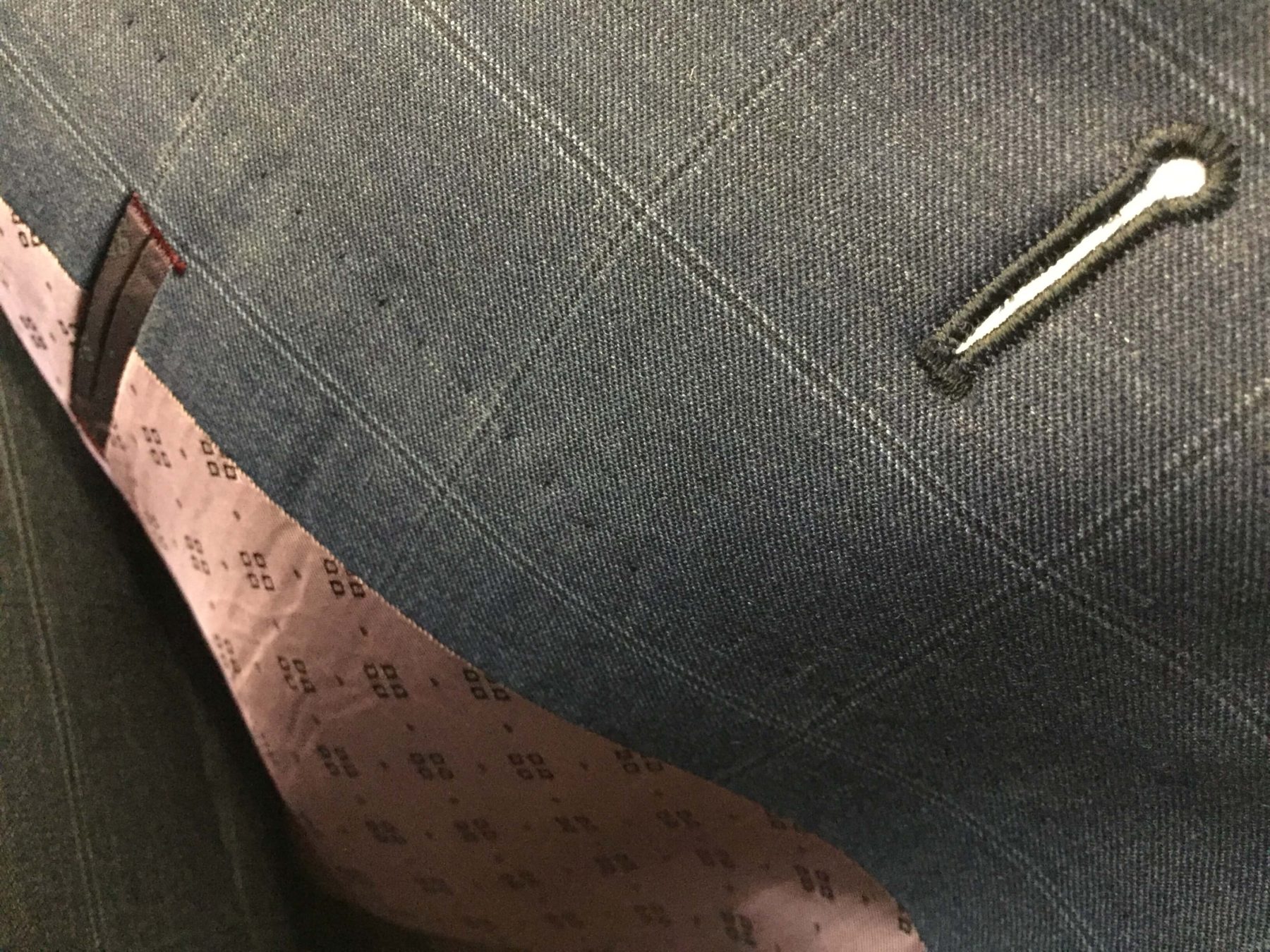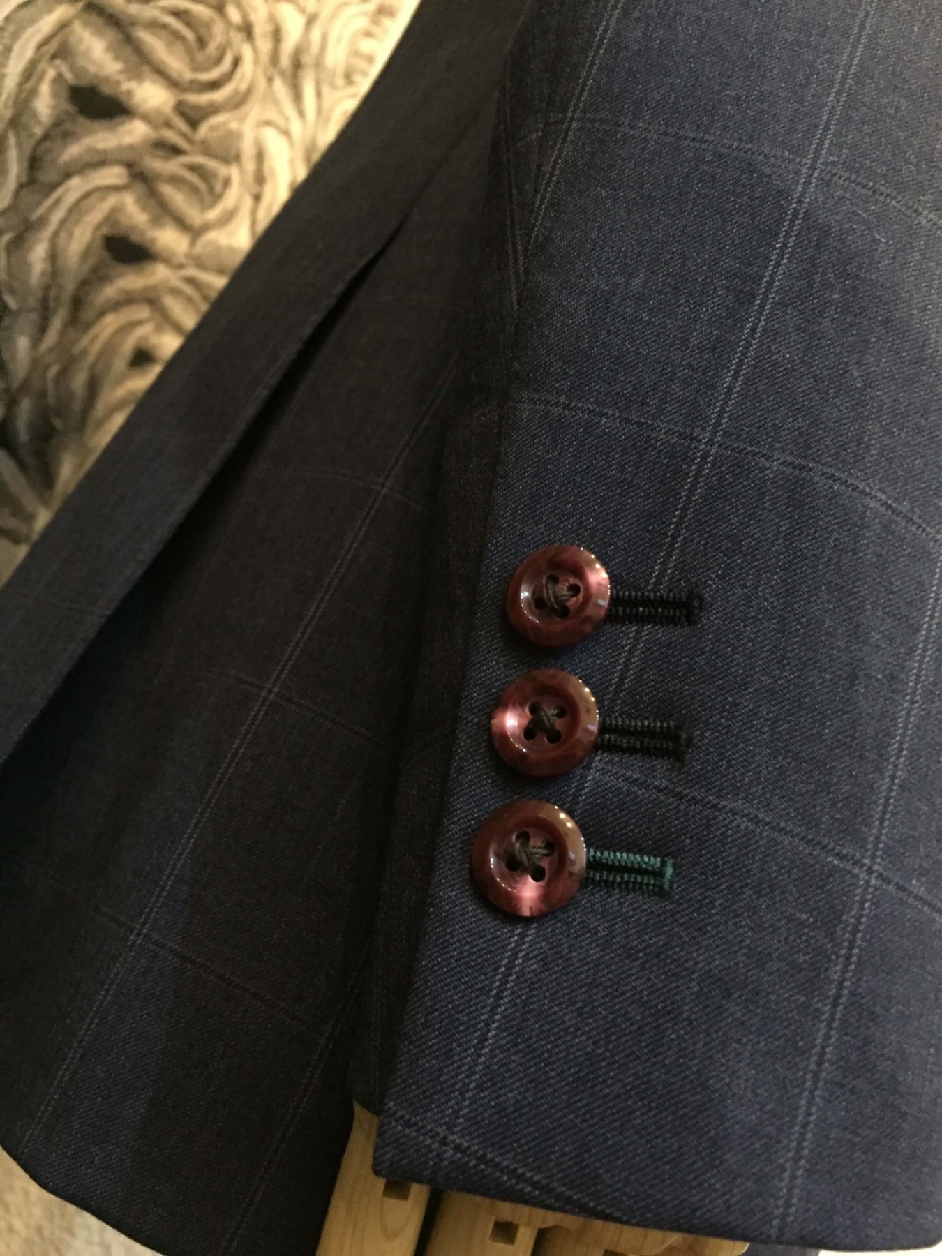 裏地には、ペイズリー柄をチョイスしジャケットには目を引く赤系、べストの背表にはペイズリー同柄ではありますが控えめな(ジャケット裏地に比べ。。)シルバーをチョイス。