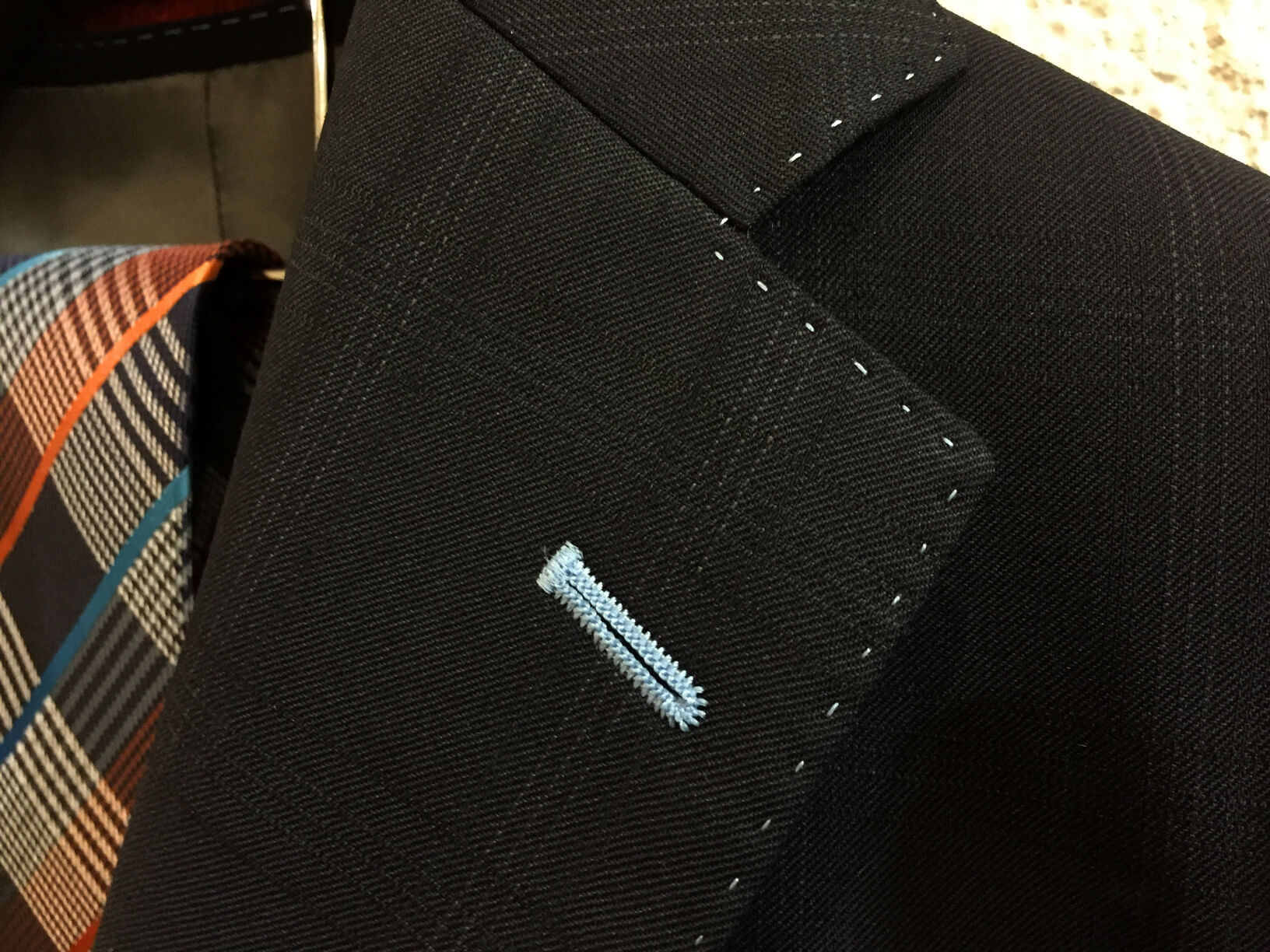 襟やポケットにはAMFステッチと呼ばれるステッチ(細かな点状の糸)を、襟穴や袖部分にはスーツに映える色糸使いを取り入れるなど所々にアクセントを散りばめています。