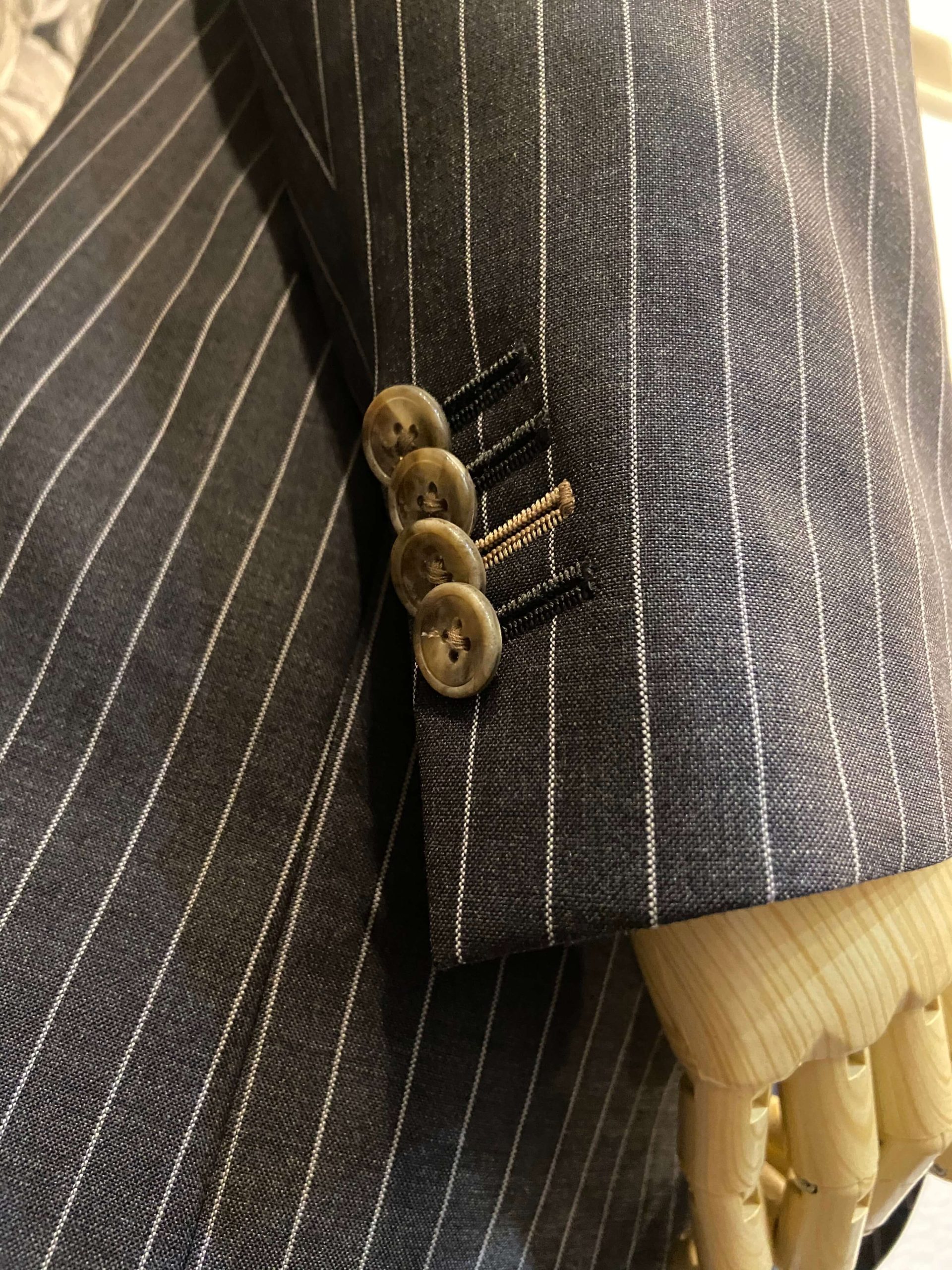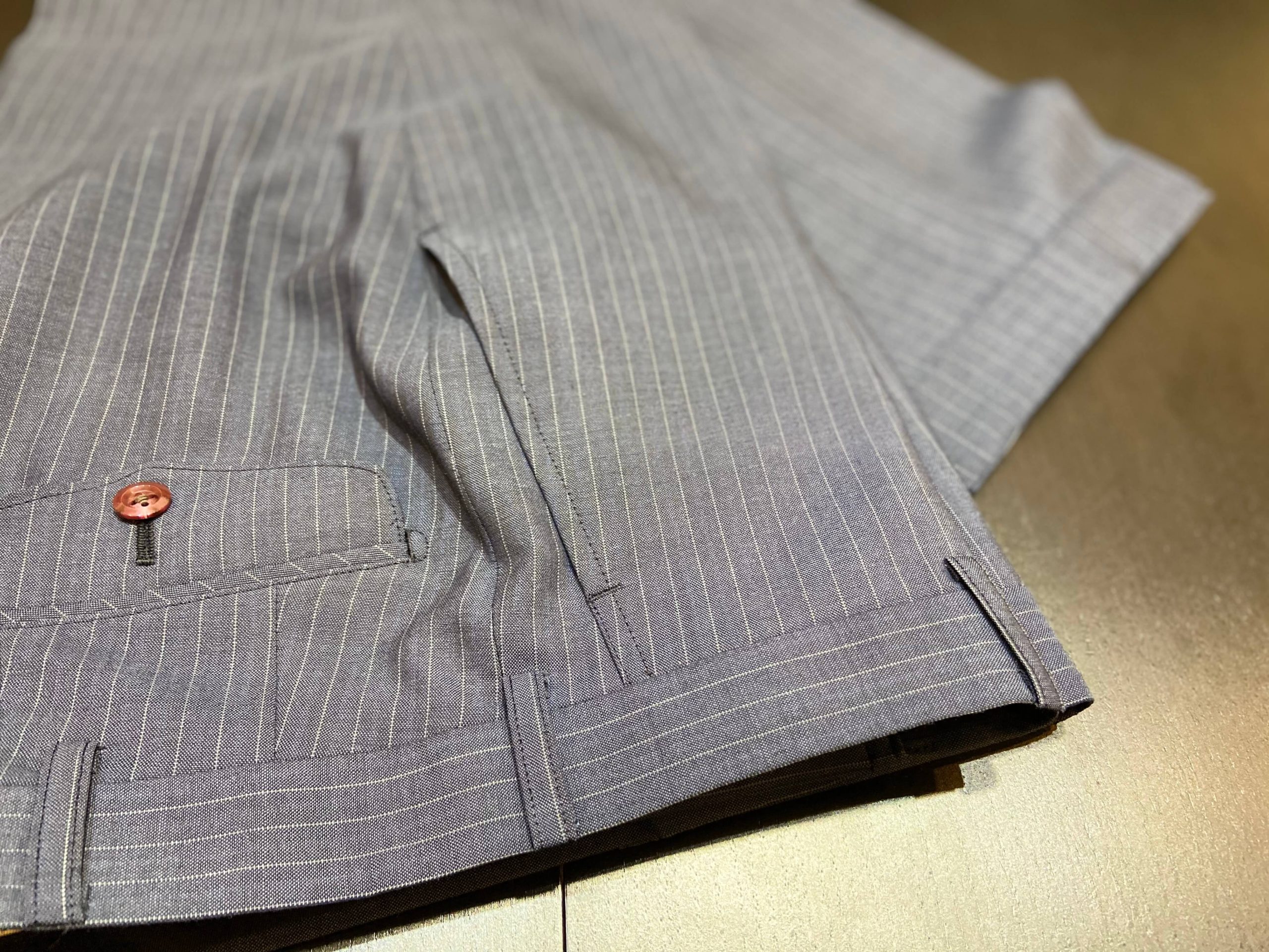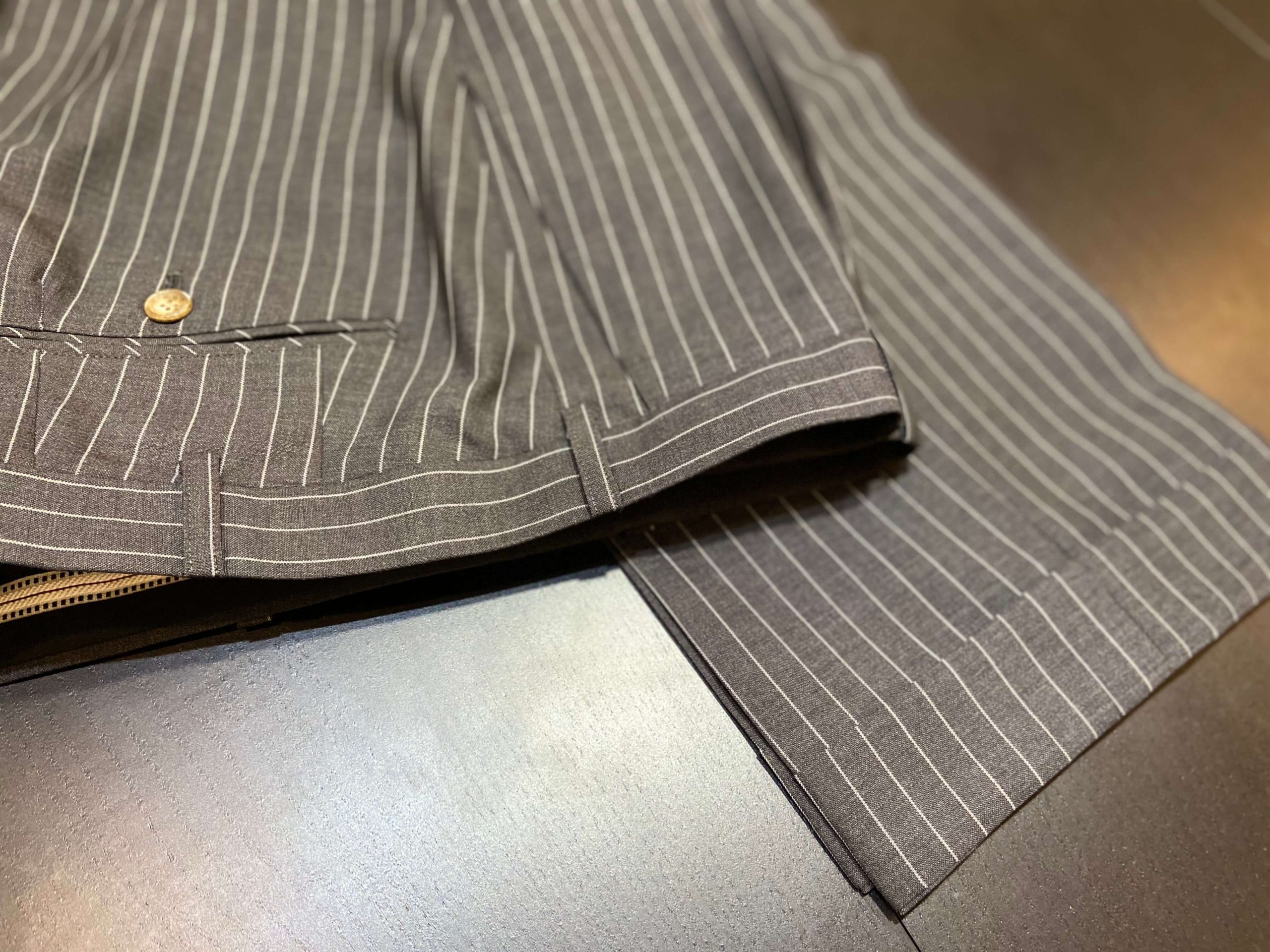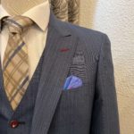 この季節ならでは楽しめるブルーグレー色のストライプ柄で3Pスーツをオーダー頂きました。