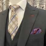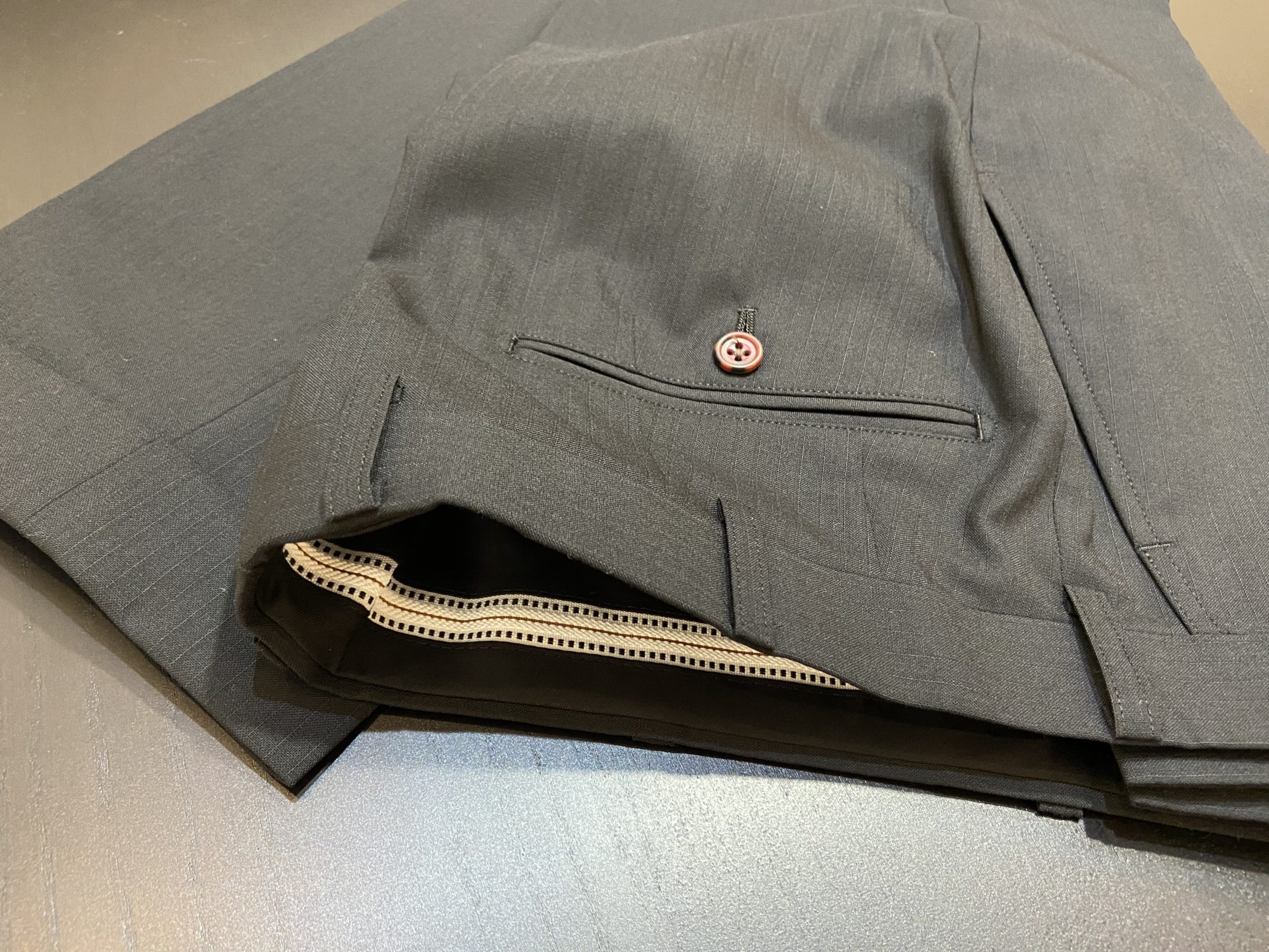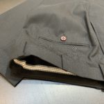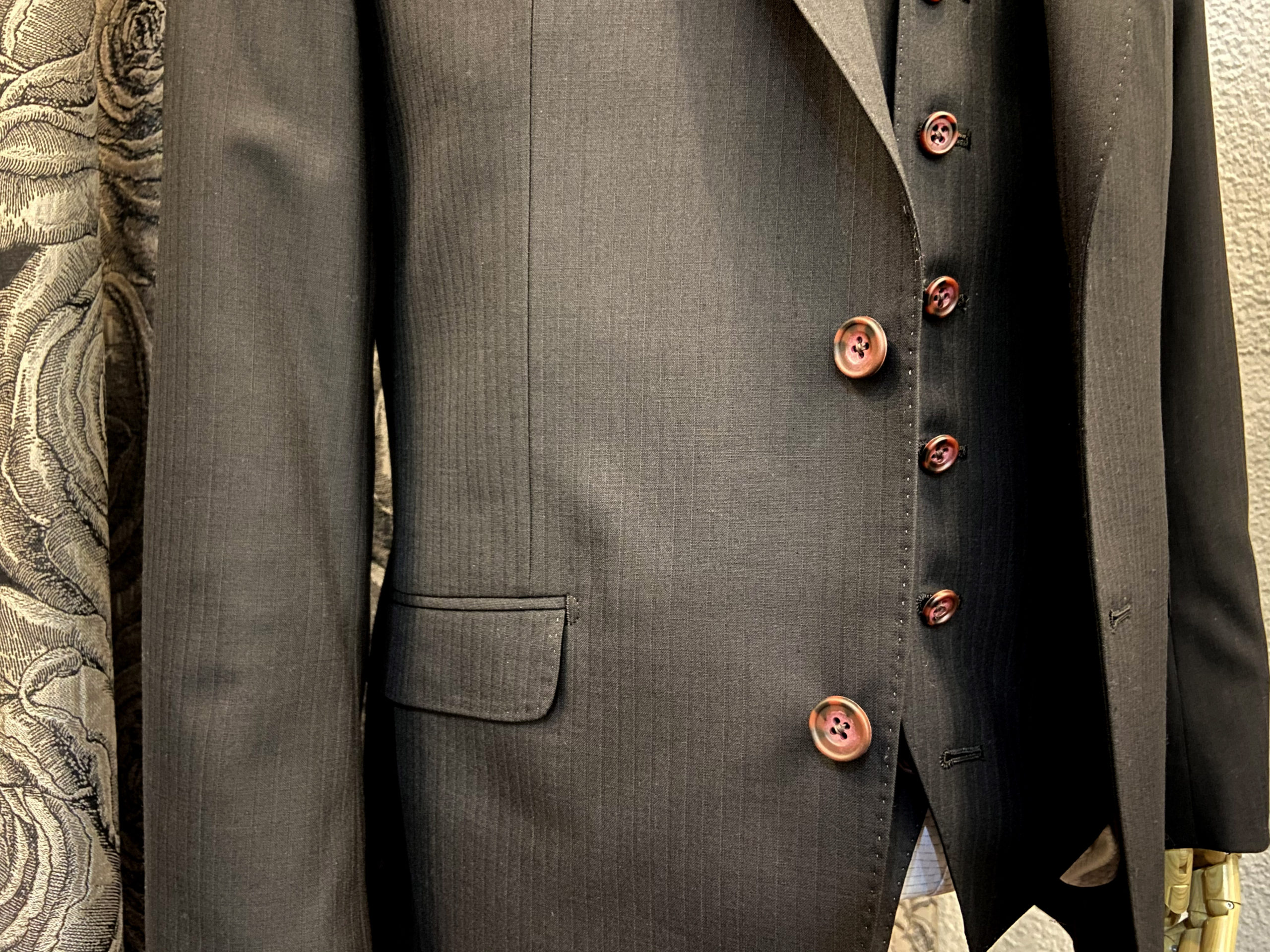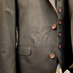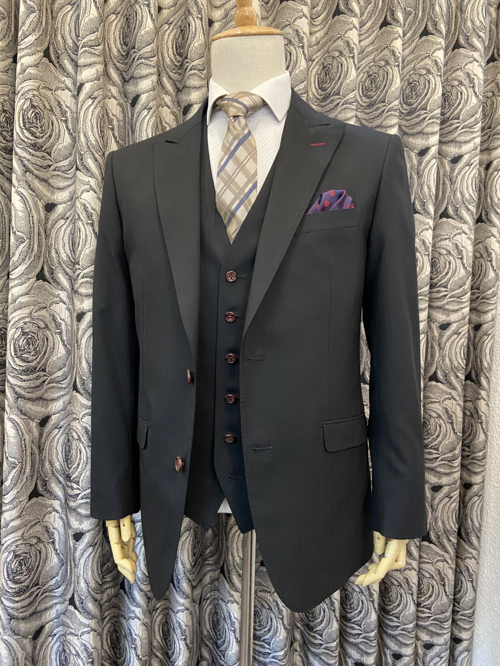 使いまわしの効くブラックスーツが欲しいとのことでストライプの織柄が入った生地でスーツ上下+ベストの3Pでオーダー頂きました。